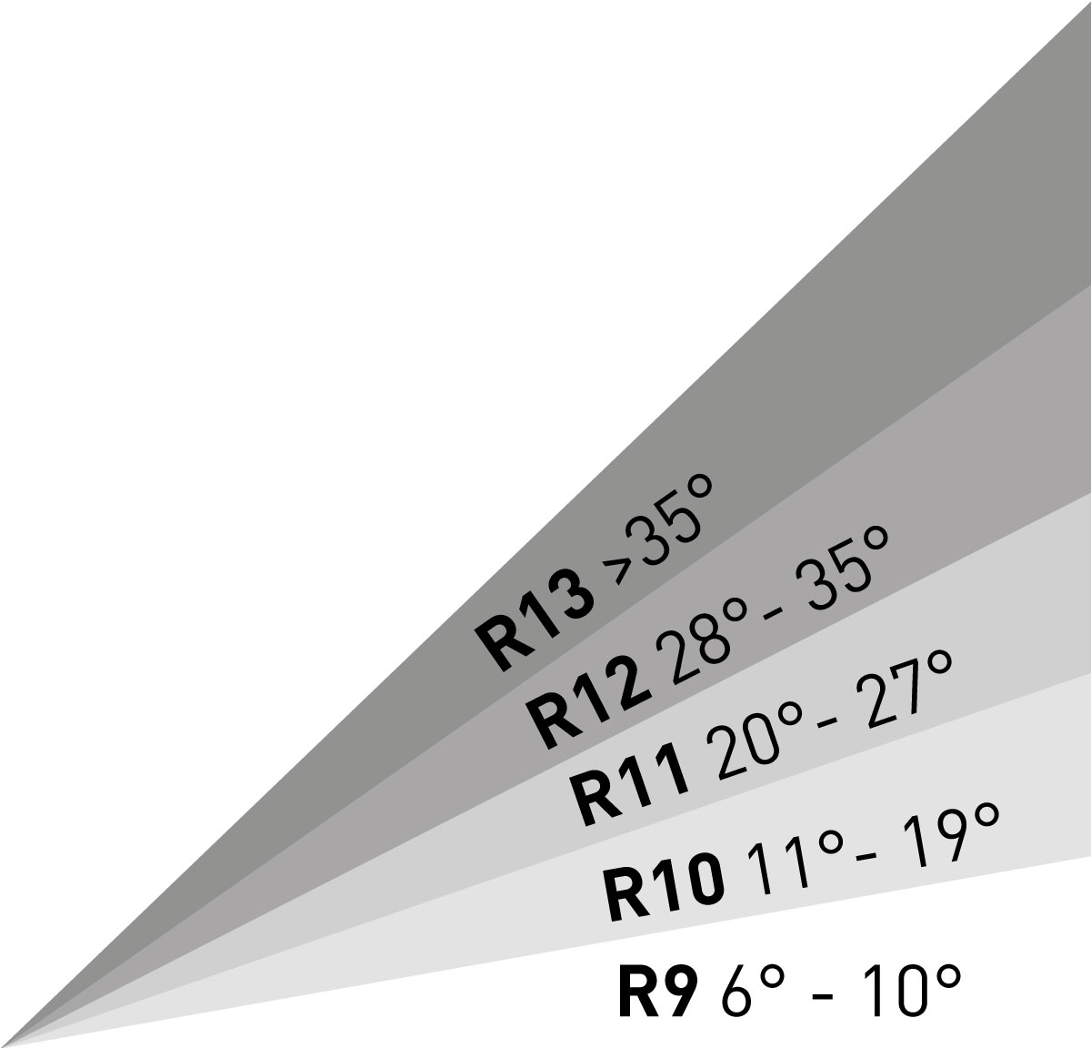 De R-waarden variëren van R9 tot R13, waarbij elke stap een hogere mate van slipweerstand betekent. Laten we ze even vrolijk voor je op een rijtje zetten: